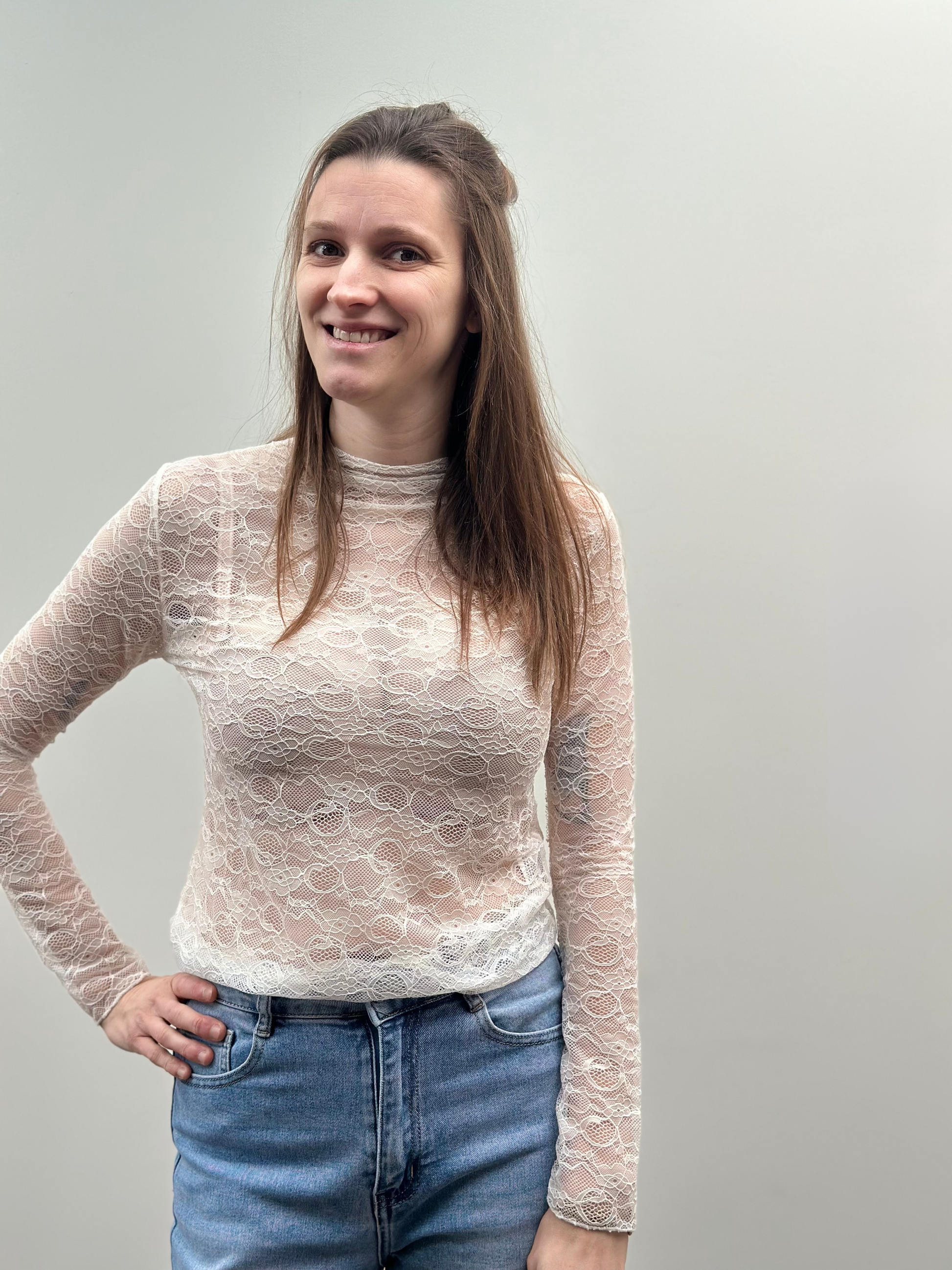 Specificaties: Aanpassen t-shirt volledig uit kant, heel tof te combineren met debardeur, of jeansjasje zonder mouwen.